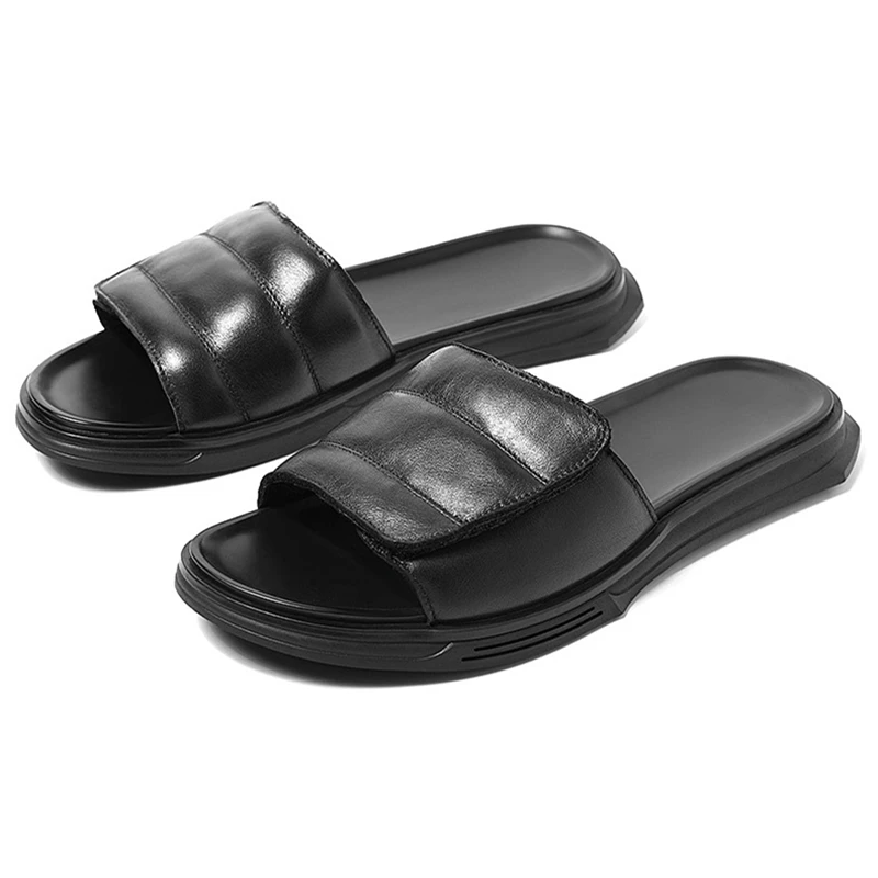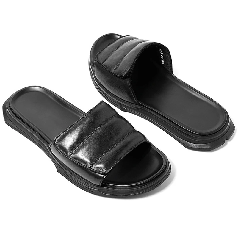 BEST Pure Black Men Genuine Leather Outdoor Slippers Fashion Man Summer Holiday Beach Causal Slides Shoe